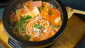 过桥米线是云南省滇南地区的一种特有的小吃,属滇菜系,该菜品起源于蒙自地区,是由汤料、佐料、生的猪里脊肉片、鸡脯肉片、乌鱼片及五成熟的猪腰片、肚头片、水发鱿鱼片制作而成。 辅料有来过的豌豆尖、韭菜,以及芫荽、葱丝、草芽丝、姜丝、玉兰片、氽过的豆腐皮;四是主食,即用水略烫过的米线。鹅油封面,汤汁滚烫,但不冒热气。